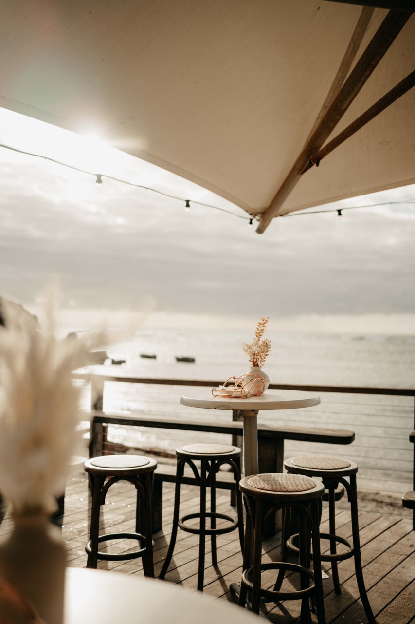 Our large indoor area has glass bi-fold doors with uninterrupted ocean views and open fireplace that can be transformed for the perfect mid-year winter-wedding venue. Imagine sitting around the fire, eating cheese and sipping delicious red wine in the company of those you love watching the wild ocean storms unfold before you.